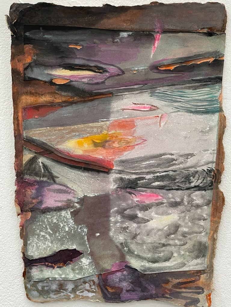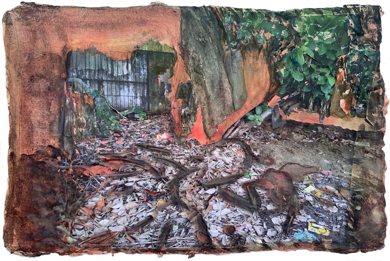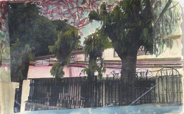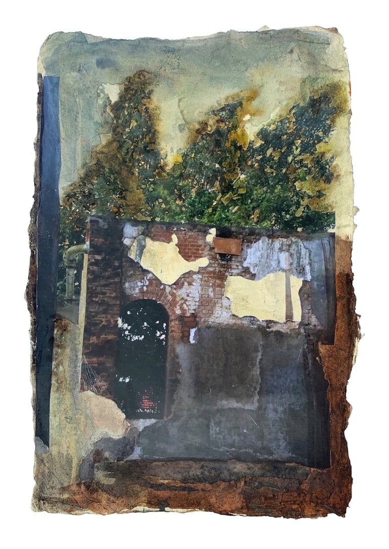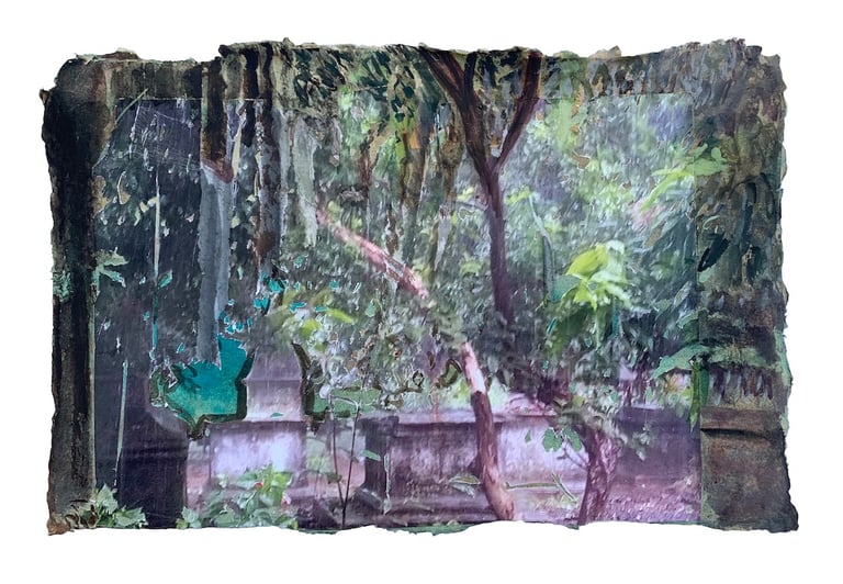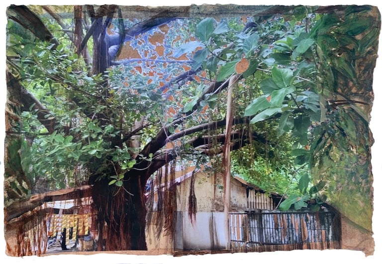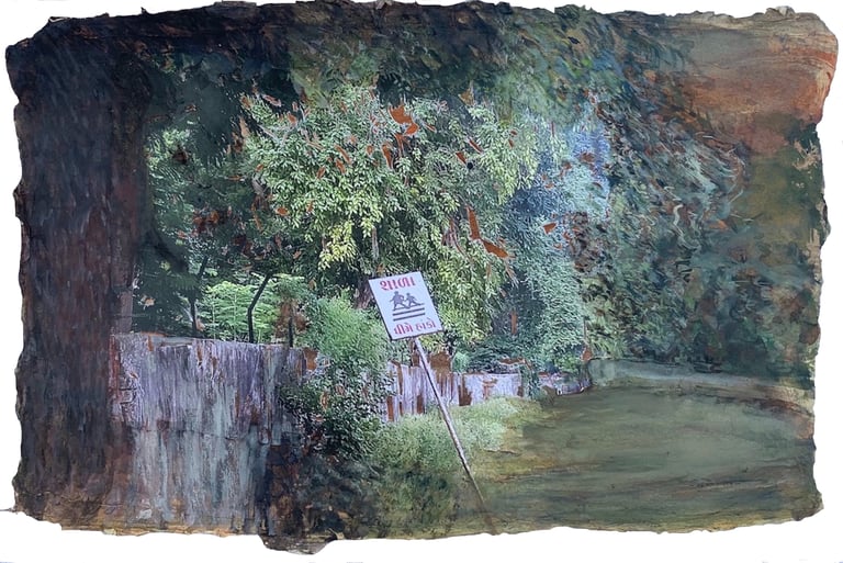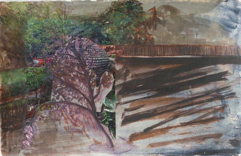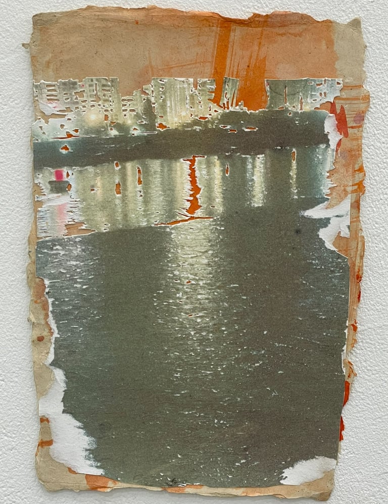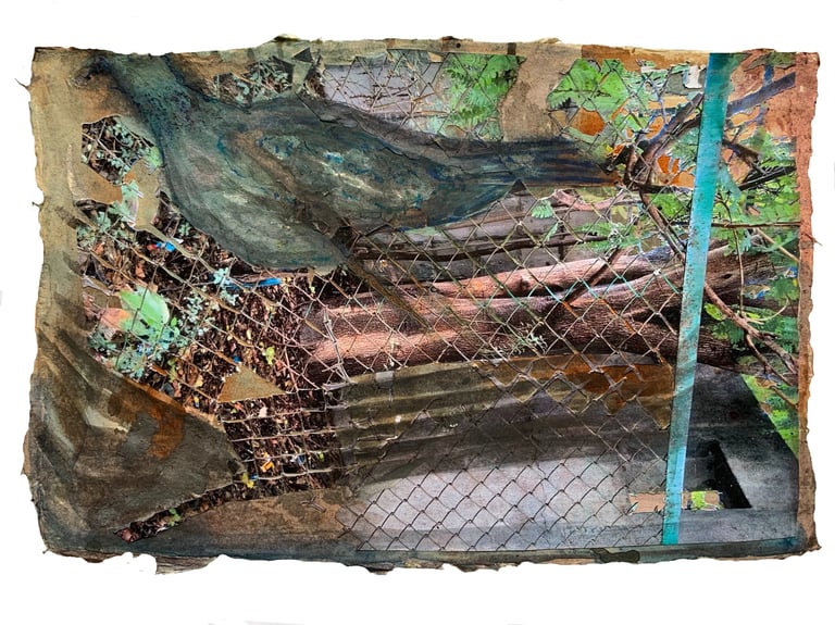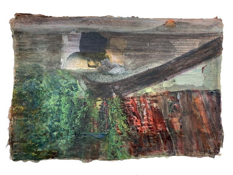 It is a process. These are a set of collages made using photographs—collected from varied sources and, more recently, my own. I use them as points of departure rather than endpoints, treating each image as a fragment to be reinterpreted through a layered process. A photograph is first affixed to the surface, then altered by subtracting, obscuring, or cutting sections before reworking them with washes of watercolor. This cycle of removal and addition creates a dialogue between image and paint. Through this method, I explore the tension between reference and invention, balancing recognition with gesture, transparency, and atmosphere to form evolving compositions.