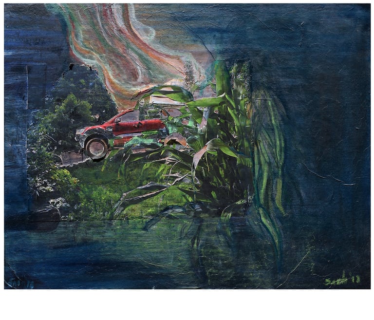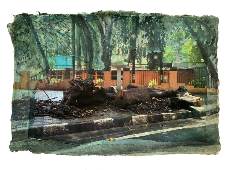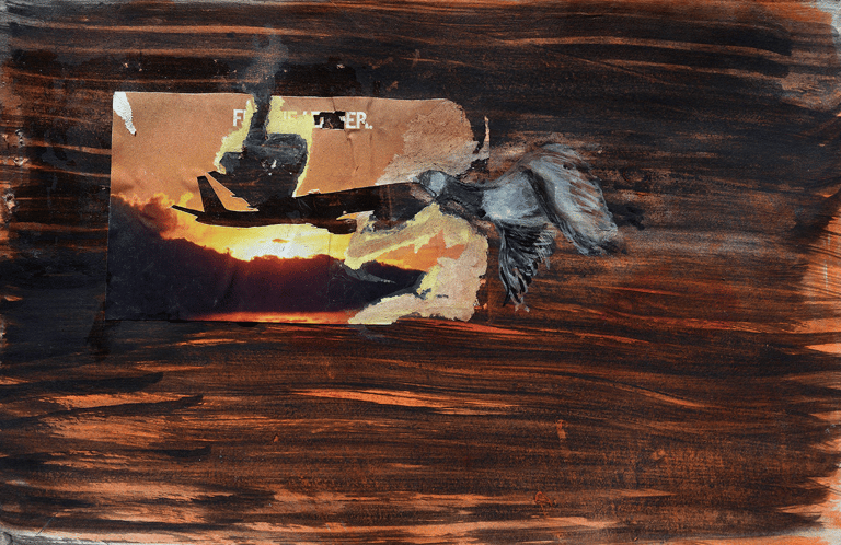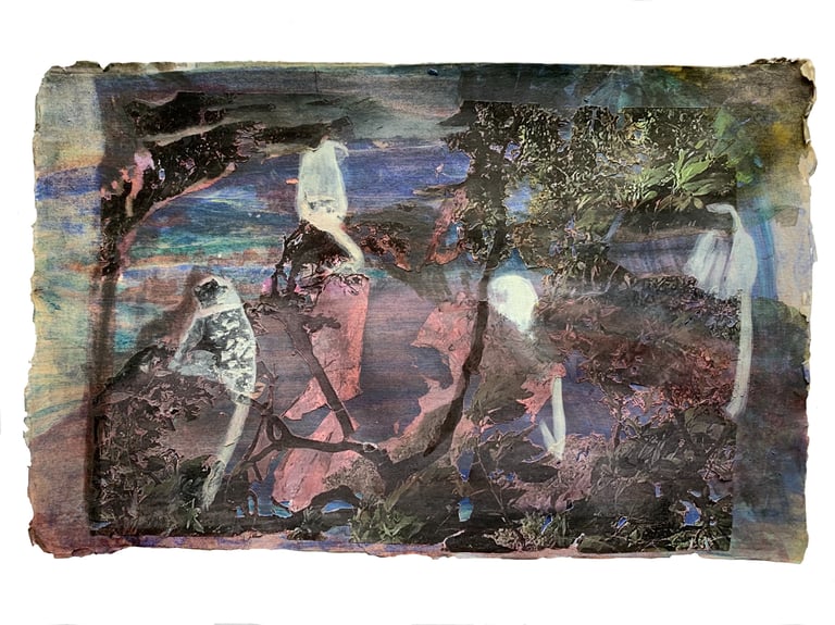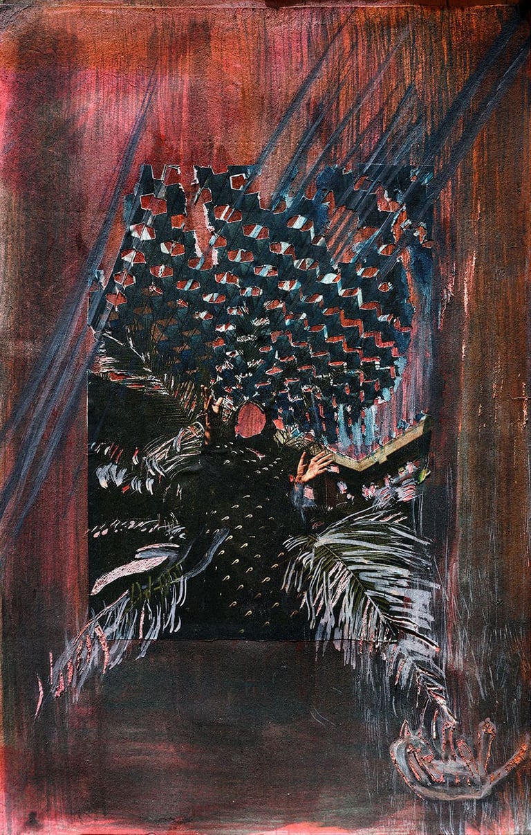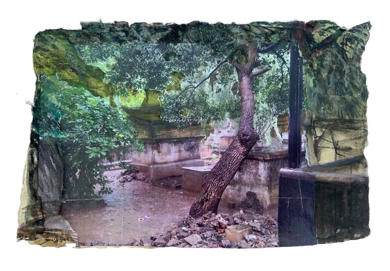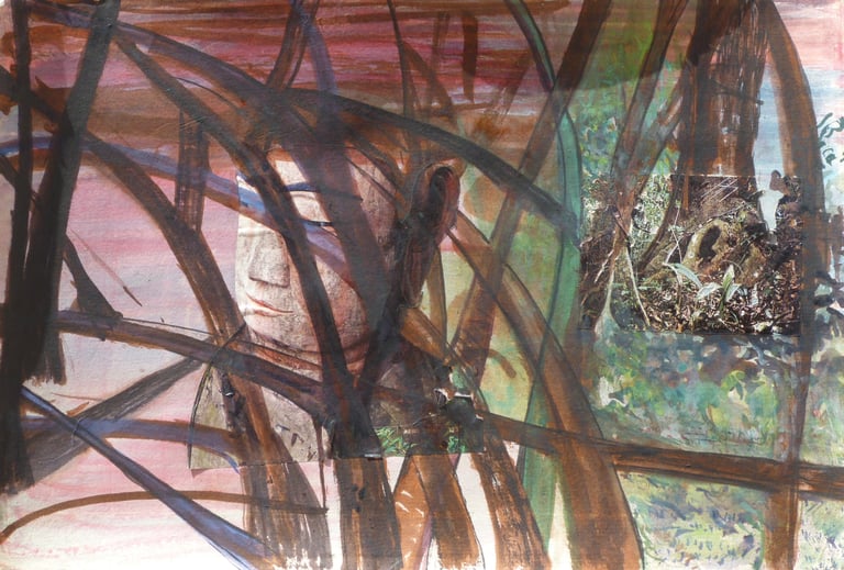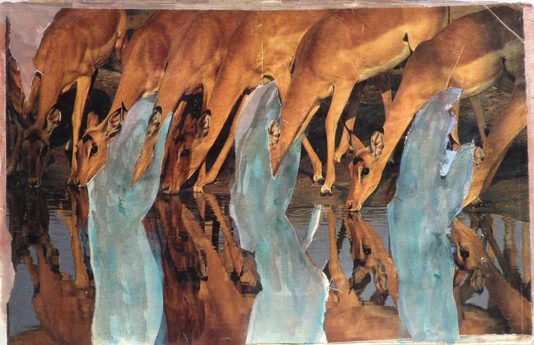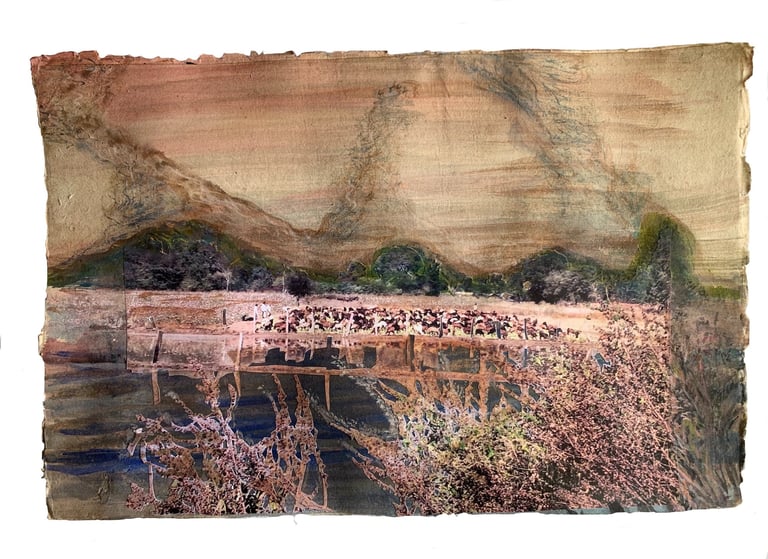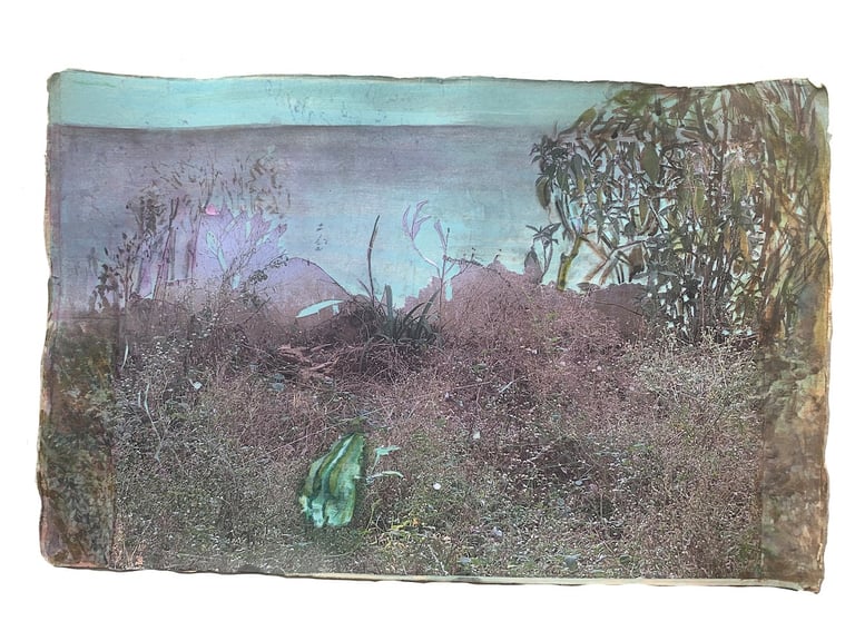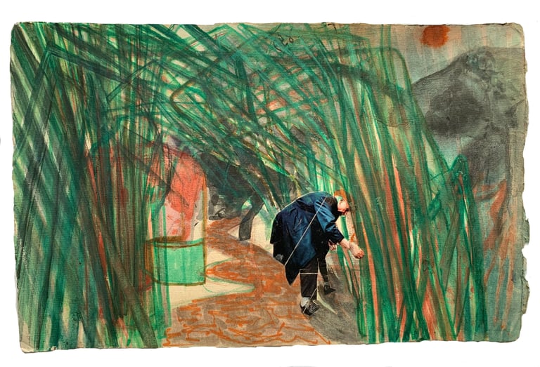 It is a process. These are a set of collages made using photographs—collected from varied sources and, more recently, my own. I use them as points of departure rather than endpoints, treating each image as a fragment to be reinterpreted through a layered process. A photograph is first affixed to the surface, then altered by subtracting, obscuring, or cutting sections before reworking them with washes of watercolor. This cycle of removal and addition creates a dialogue between image and paint. Through this method, I explore the tension between reference and invention, balancing recognition with gesture, transparency, and atmosphere to form evolving compositions.