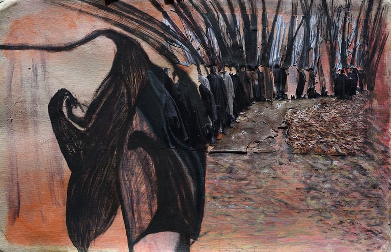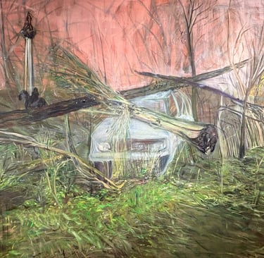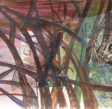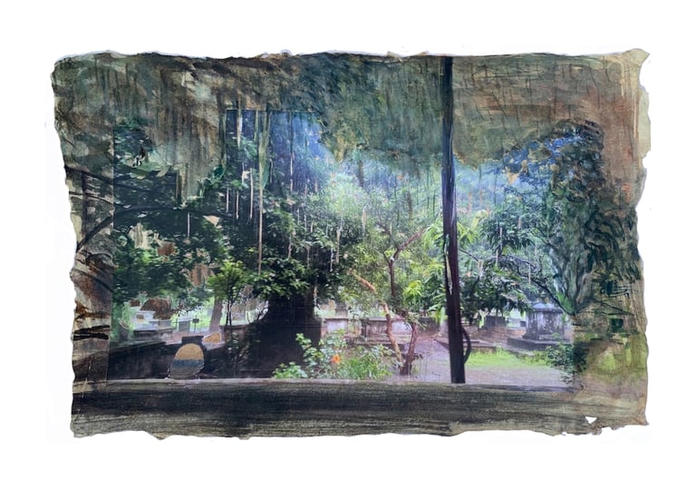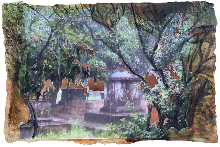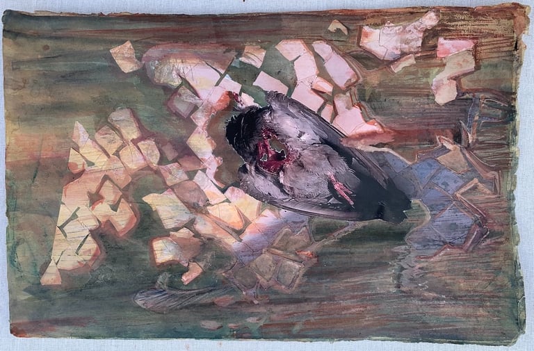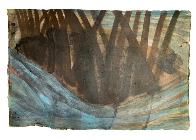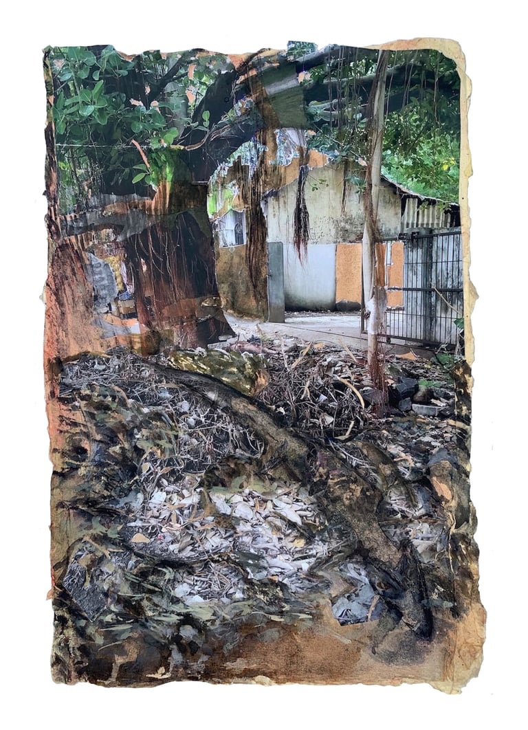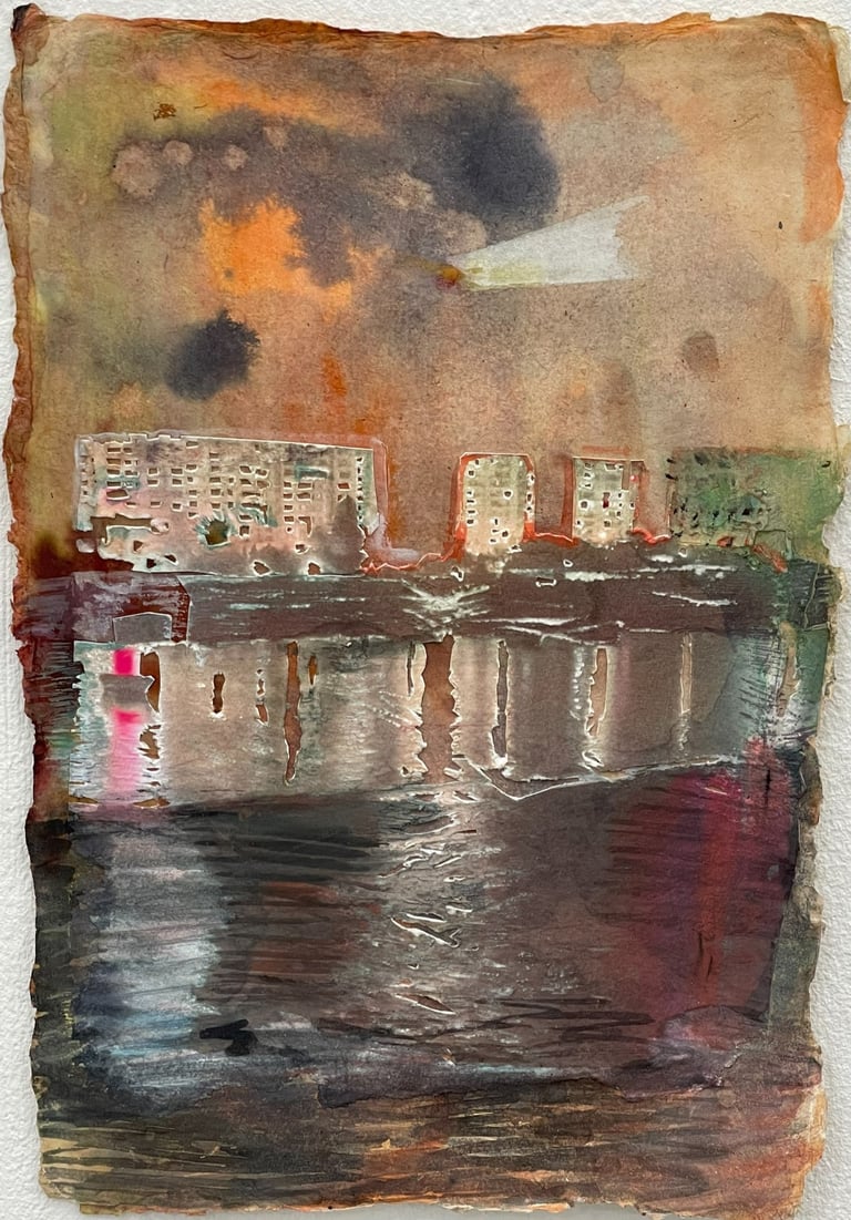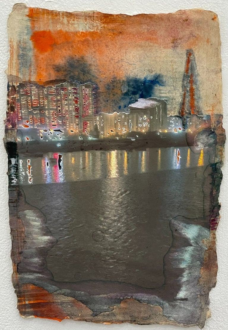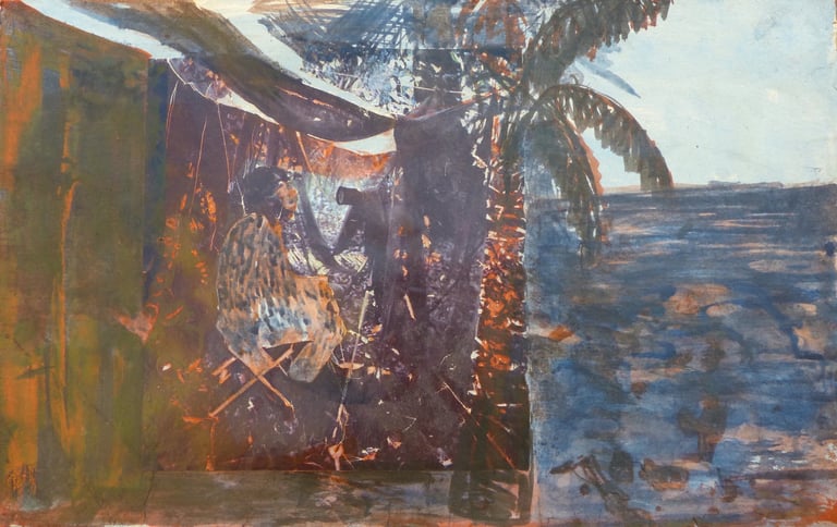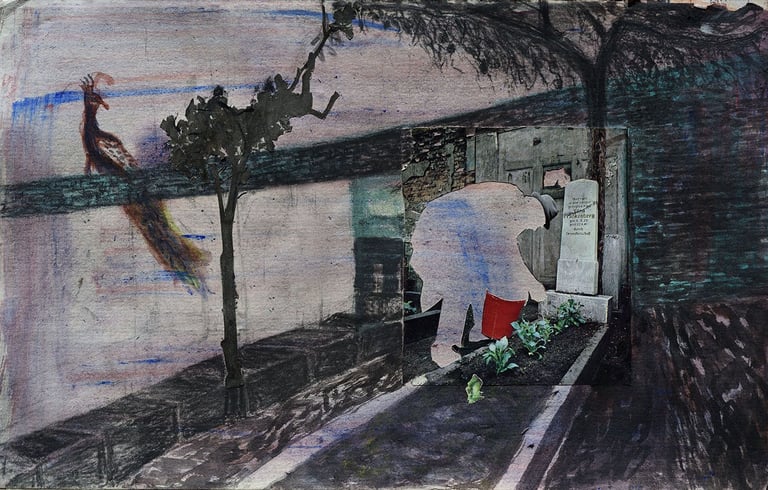 It is a process. These are a set of collages made using photographs—collected from varied sources and, more recently, my own. I use them as points of departure rather than endpoints, treating each image as a fragment to be reinterpreted through a layered process. A photograph is first affixed to the surface, then altered by subtracting, obscuring, or cutting sections before reworking them with washes of watercolor. This cycle of removal and addition creates a dialogue between image and paint. Through this method, I explore the tension between reference and invention, balancing recognition with gesture, transparency, and atmosphere to form evolving compositions.