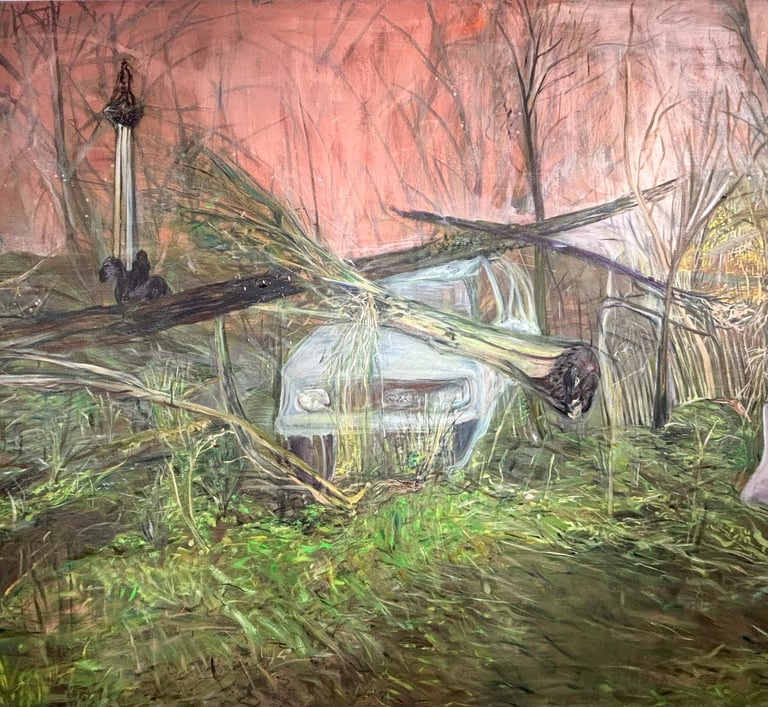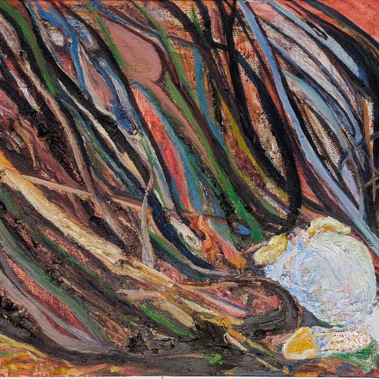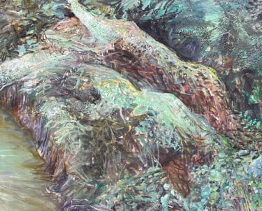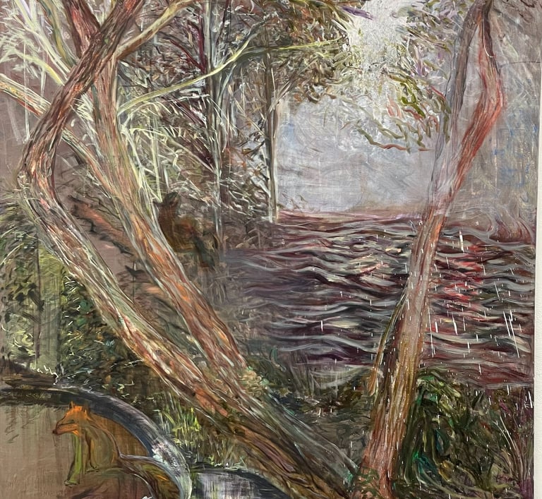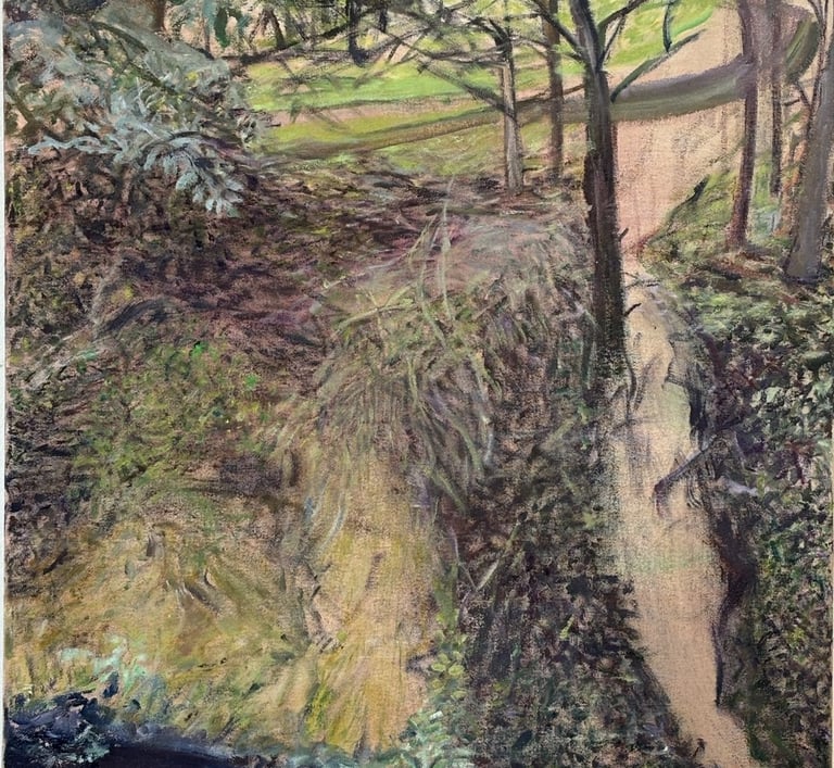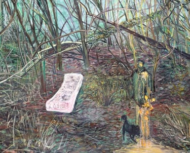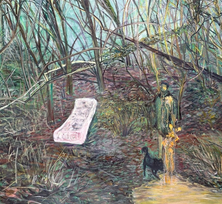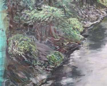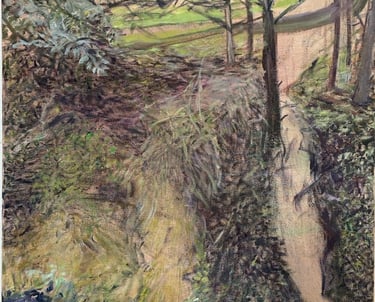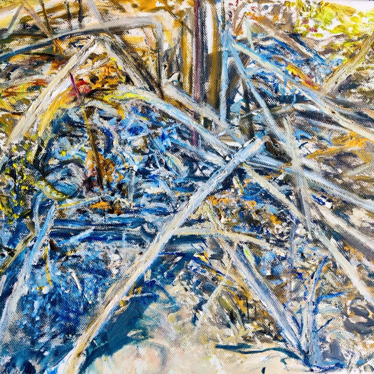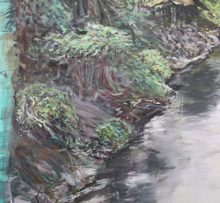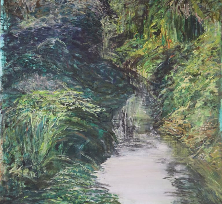 My paintings are a reconciliation with the act of painting as a collaboration with vibrant matter itself. These scrubbing scrublands and fluid spectres of modernity reveal the precariousness of visual meaning-making in a way that calls to mind N.J. Berrill’s cosmic reflections: